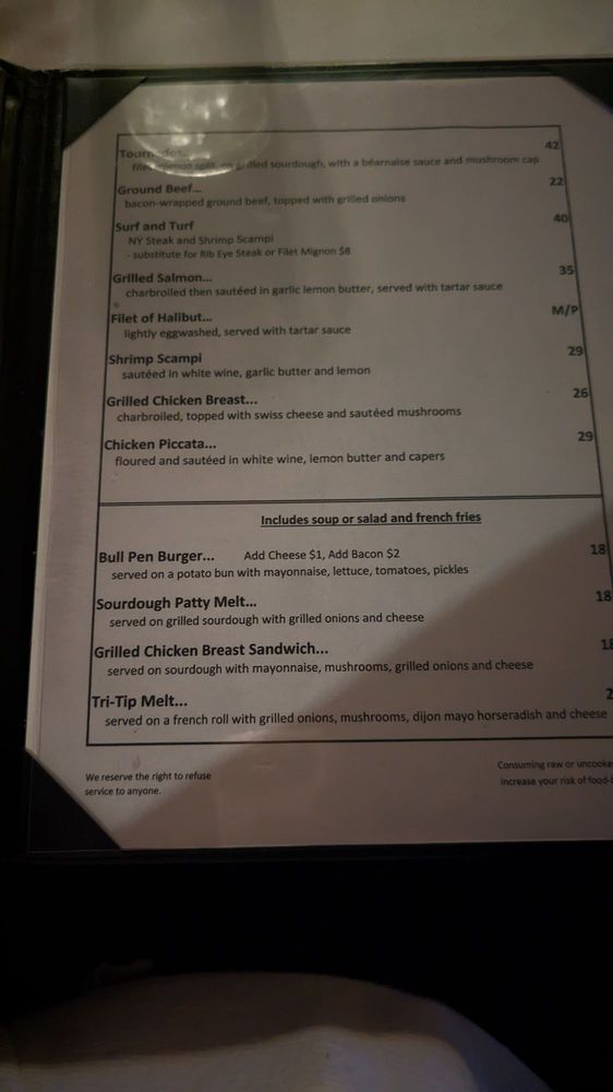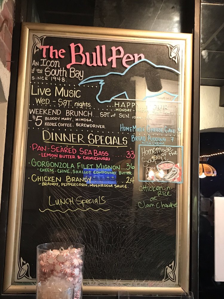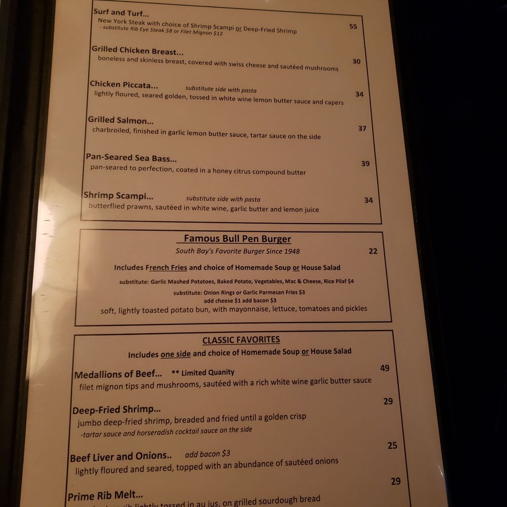 Introducing The Bull Pen, a unique dining experience in Redondo Beach, CA, blending old-school charm with delicious menu offerings. With a focus on quality steaks, seafood, and bar classics, The Bull Pen offers a variety of options for everyone, including vegetarians. From their signature Bull Pen Burger to the succulent Prime Rib served on weekends, each dish is crafted with care and seasoned to perfection. The dimly lit ambiance, live music, and attentive service create a cozy and inviting atmosphere for guests to enjoy. Standout dishes like the NY Steak and the Coulotte are packed with flavor and sure to satisfy any craving. The Bull Pen's commitment to tradition and outstanding food make it a must-visit for a memorable dining experience.